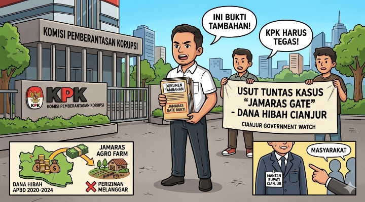 Wartacianjurnews.com – Aktivis yang tergabung dalam Cianjur Government Watch kembali mendatangi Komisi Pemberantasan Korupsi (KPK) untuk ketiga kalinya, guna menindaklanjuti laporan dugaan penyalahgunaan dana hibah APBD Kabupaten Cianjur tahun 2020–2024 yang dikenal dengan kasus “Jamaras Gate”.