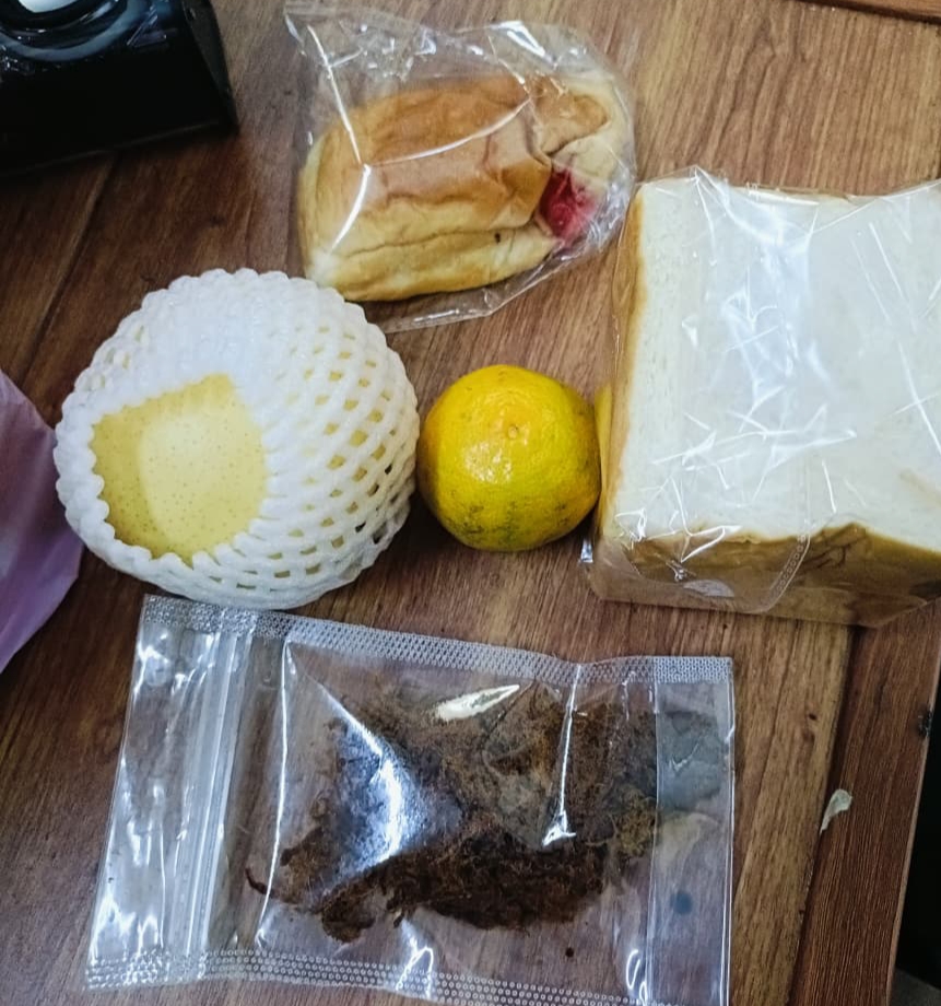 Rinciannya, roti diperkirakan seharga Rp1.500, roti tawar Rp5.000, abon sapi Rp5.000, jeruk Rp1.000, dan buah pir sekitar Rp5.000.