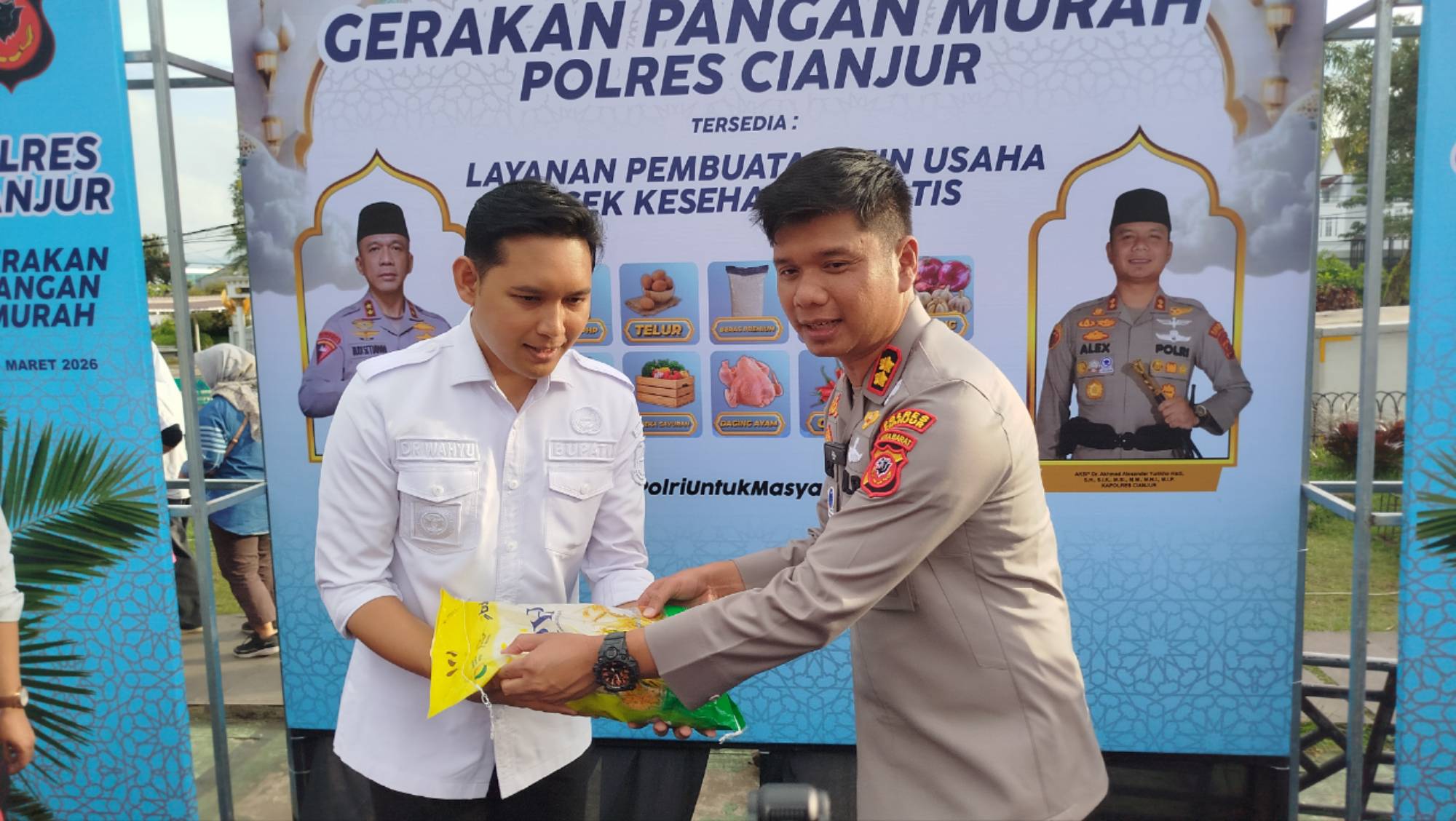 Teks: Wakapolres Cianjur Kompol Ardi dan pejabat Satreskrim Polres Cianjur melayani masyarakat dalam kegiatan Gerakan Pangan Murah di Alun-alun Cianjur.
