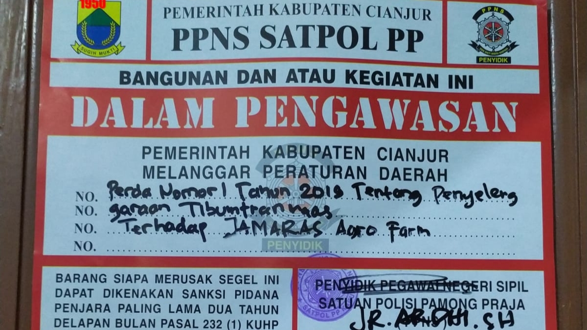Wartacianjurnews.com – Pemerintah Kabupaten Cianjur mulai menertibkan aktivitas di Jamaras Agro Farm, Kecamatan Cugenang, Selasa (14/4/2026), yang disebut milik mantan Bupati Cianjur, Herman Suherman. Satpol PP memasang stiker “Dalam Pengawasan” setelah menemukan perizinan usaha belum lengkap.