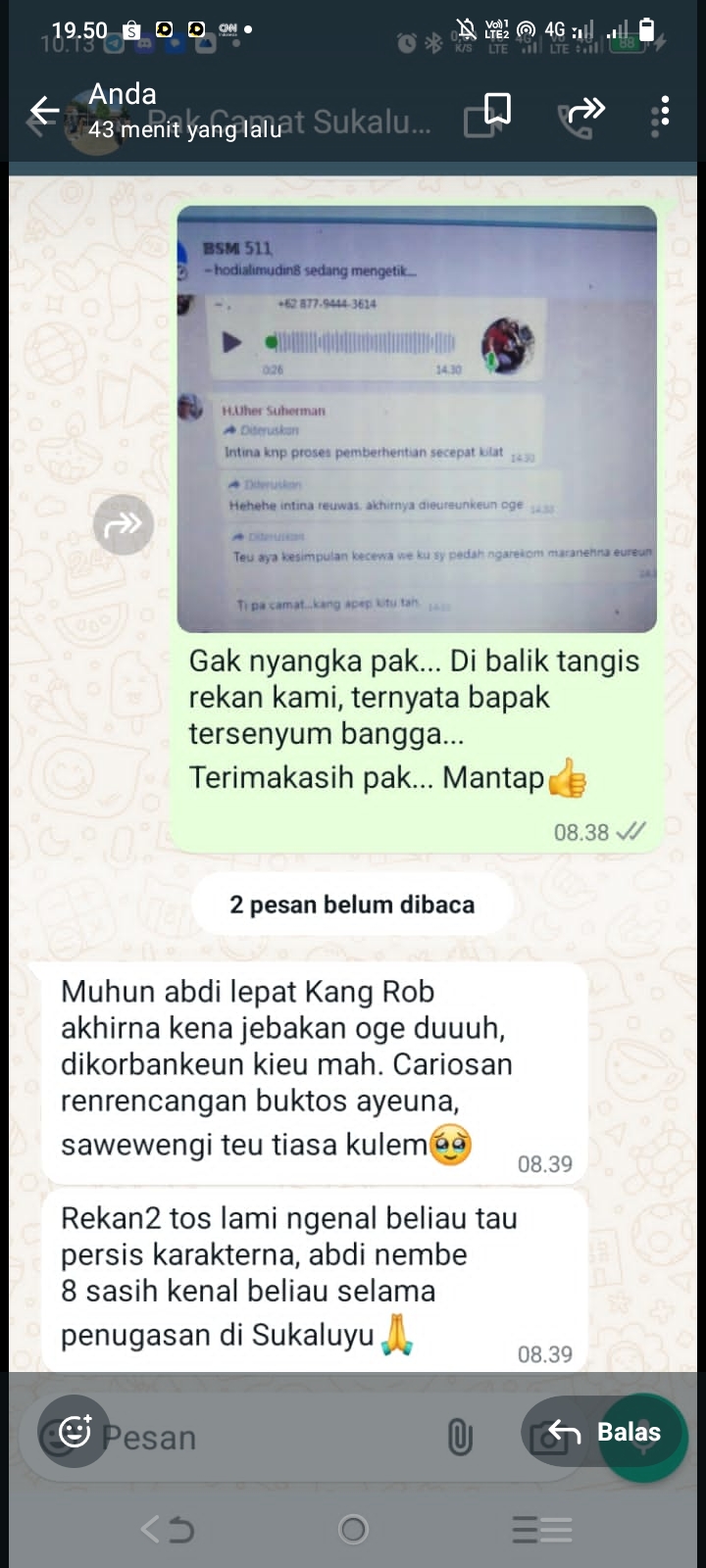 “Saya sudah memanggil Kades Sukaluyu untuk mengklarifikasi terhadap chating pribadi saya yang sengaja disebarluaskan oleh bersangkutan,” ujarnya.