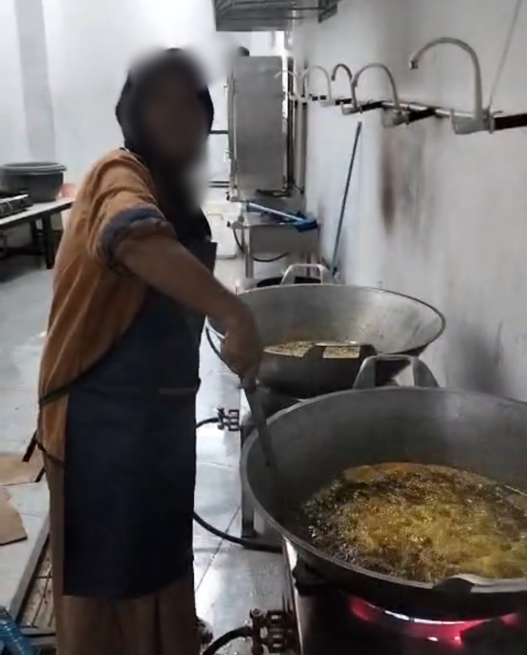Pada sebuah video yang tersebar, tampak juru masak terlihat menggoreng bahan-bahan untuk menu MBG di sebuah wajan dengan kondisi api besar dan minyak yang terlihat hitam.