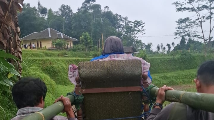 Namun, proses evakuasi bukan perkara mudah. Akses menuju rumah pasien tak bisa dilalui kendaraan, termasuk ambulans, akibat jalan yang rusak berat, licin, dan terdampak retakan tanah serta longsor.
