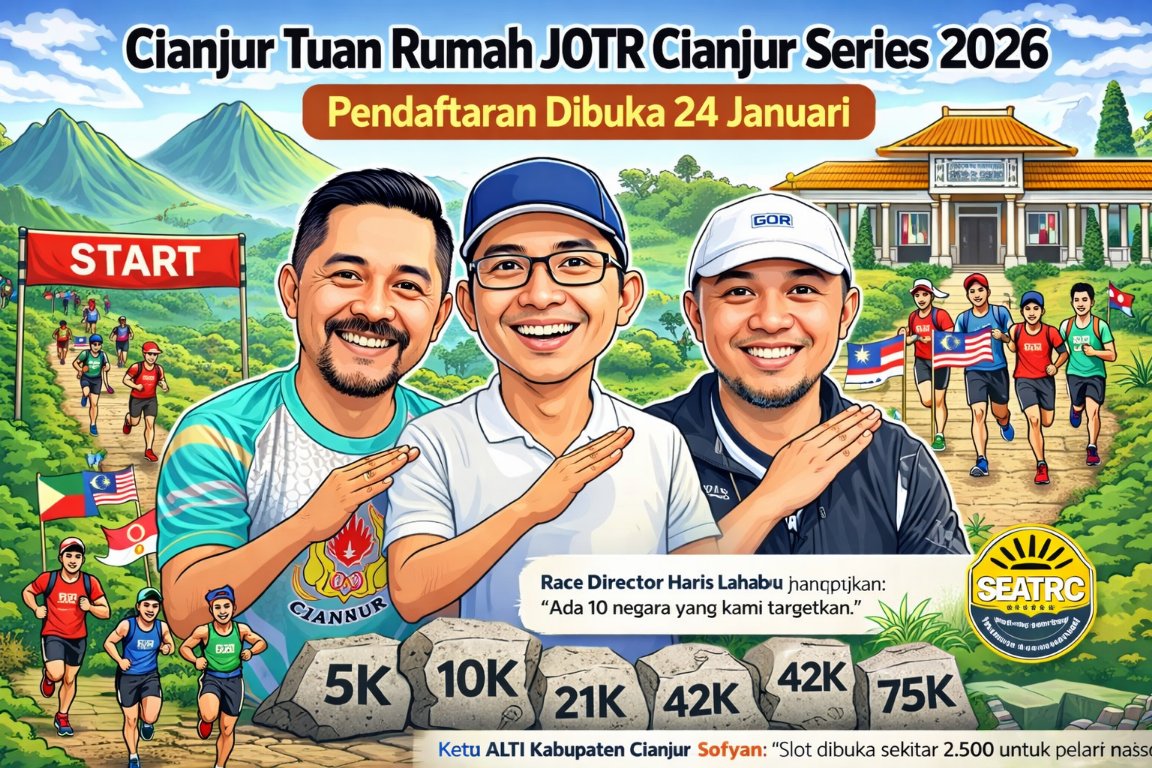 Wartacianjurnews.com — Kabupaten Cianjur resmi menjadi tuan rumah JOTR Cianjur Series 2026 yang masuk kalender Kejuaraan Lari Trail Asia Tenggara (SEATRC), dengan pendaftaran dibuka pada Sabtu, 24 Januari 2026.