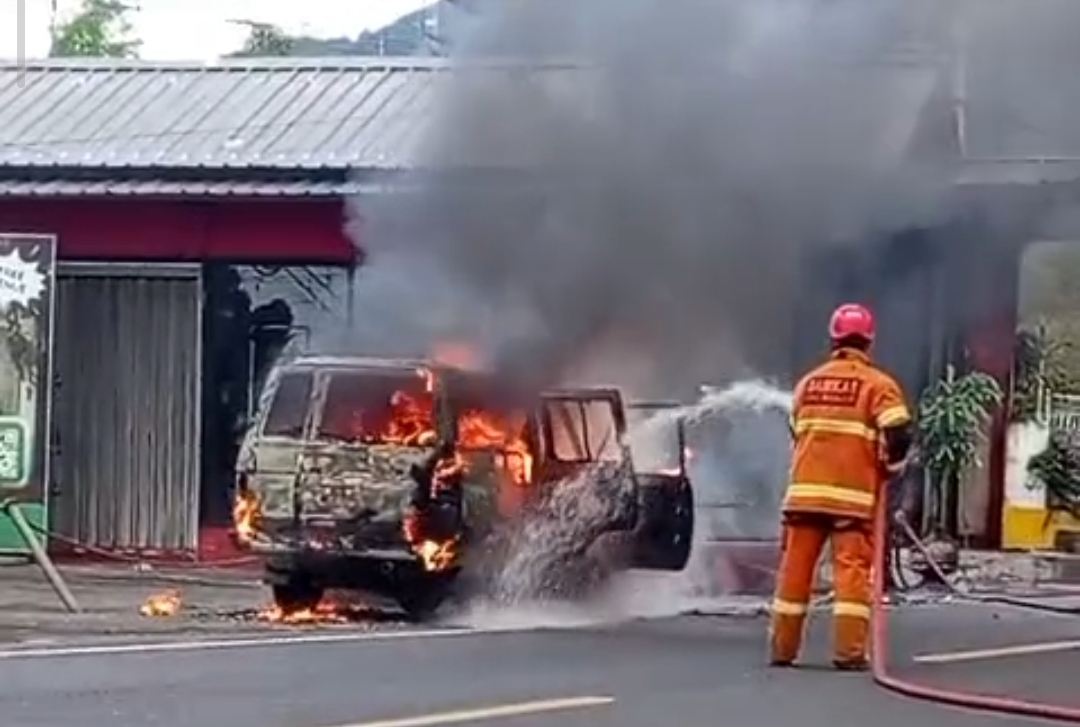 Wartacianjurnews.com — Sebuah minibus yang diduga membawa jeriken berisi bahan bakar minyak (BBM) terbakar di Jalan Raya Puncak, Desa Ciloto, Kecamatan Cipanas, Kabupaten Cianjur, Selasa (2/12/2025) sekitar pukul 08.00 WIB. Pengemudi mengalami luka bakar ringan dan dilarikan ke RSUD Cimacan.
