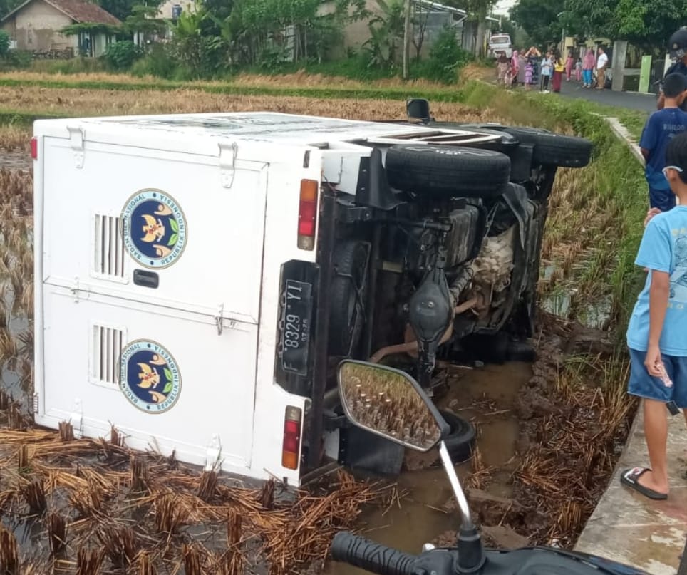 Namun, saat melintasi lokasi kejadian kendaraan mendadak tidak terkendali hingga akhirnya keluar jalur dan tercebur ke area persawahan yang berada di bawah jalan.