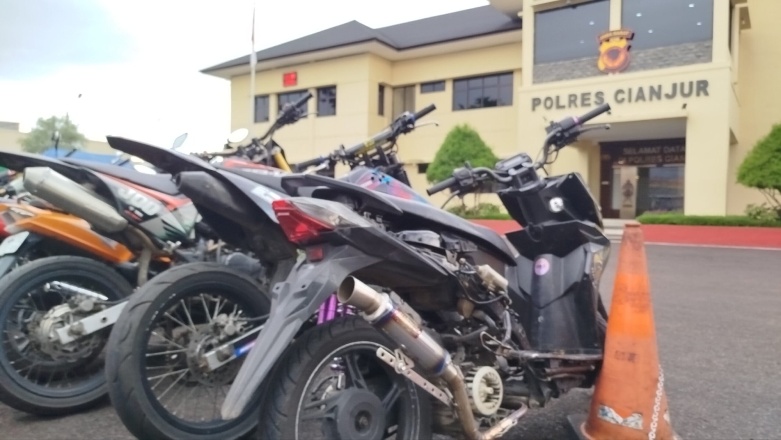 Teks: Motor hasil penindakan knalpot brong terparkir di Mapolres