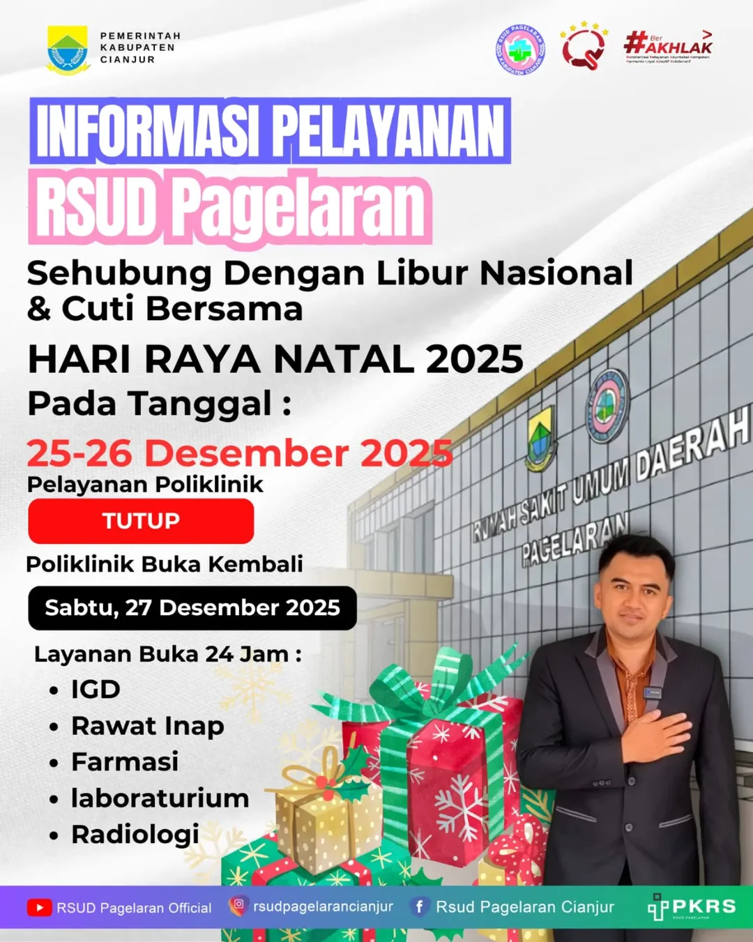 “Kami informasikan bahwa pelayanan poliklinik rawat jalan RSUD Pagelaran pada hari Kamis dan Jumat 25 dan 26 Desember 2025 tutup,” kata Irvan, Kamis 25 Desember 2025.