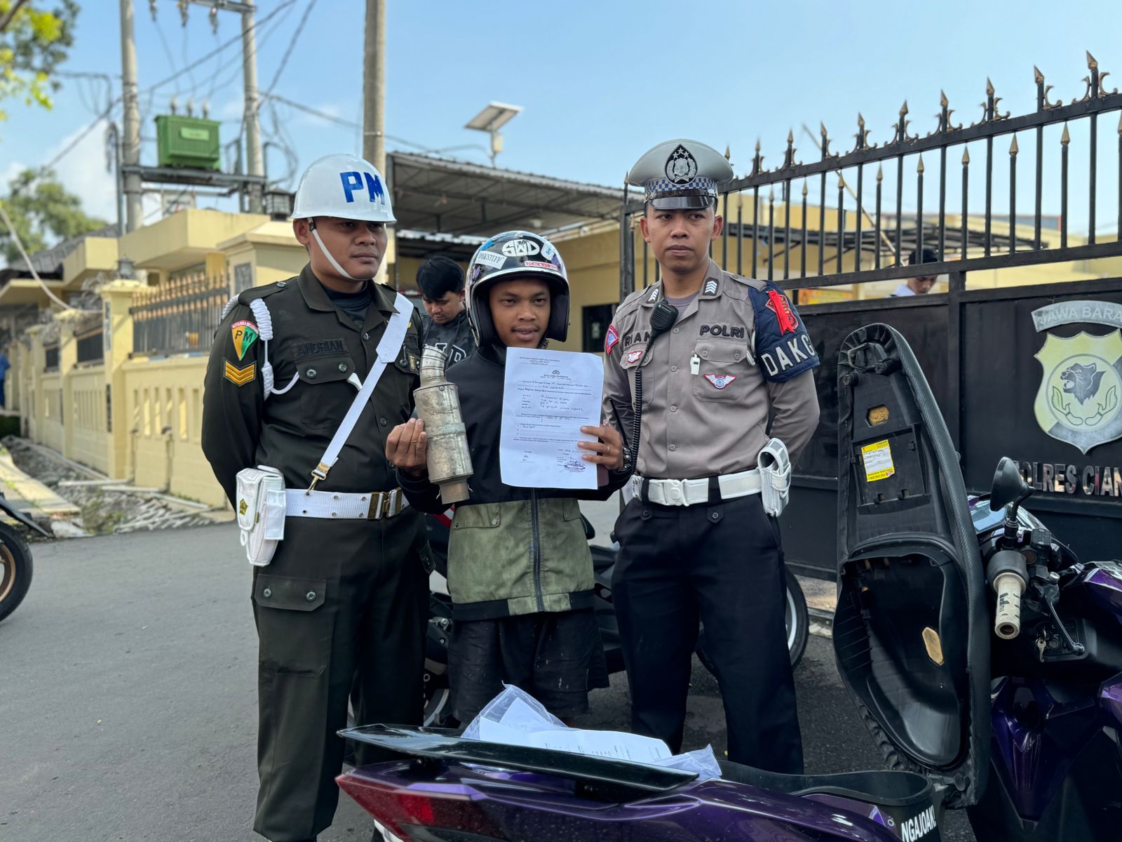 WartaCianjur- Tim gabungan yang terdiri dari Polres Cianjur, Polisi Militer, Kodim 0608 Cianjur, Satpol PP Cianjur melakukan penertiban terhadap pengendara bermotor yang memakai knalpot brong/tidak standar nasional indonesia (SNI) di beberapa titik termasuk di depan Mapolres Cianjur, Kamis, (11/01/2024).