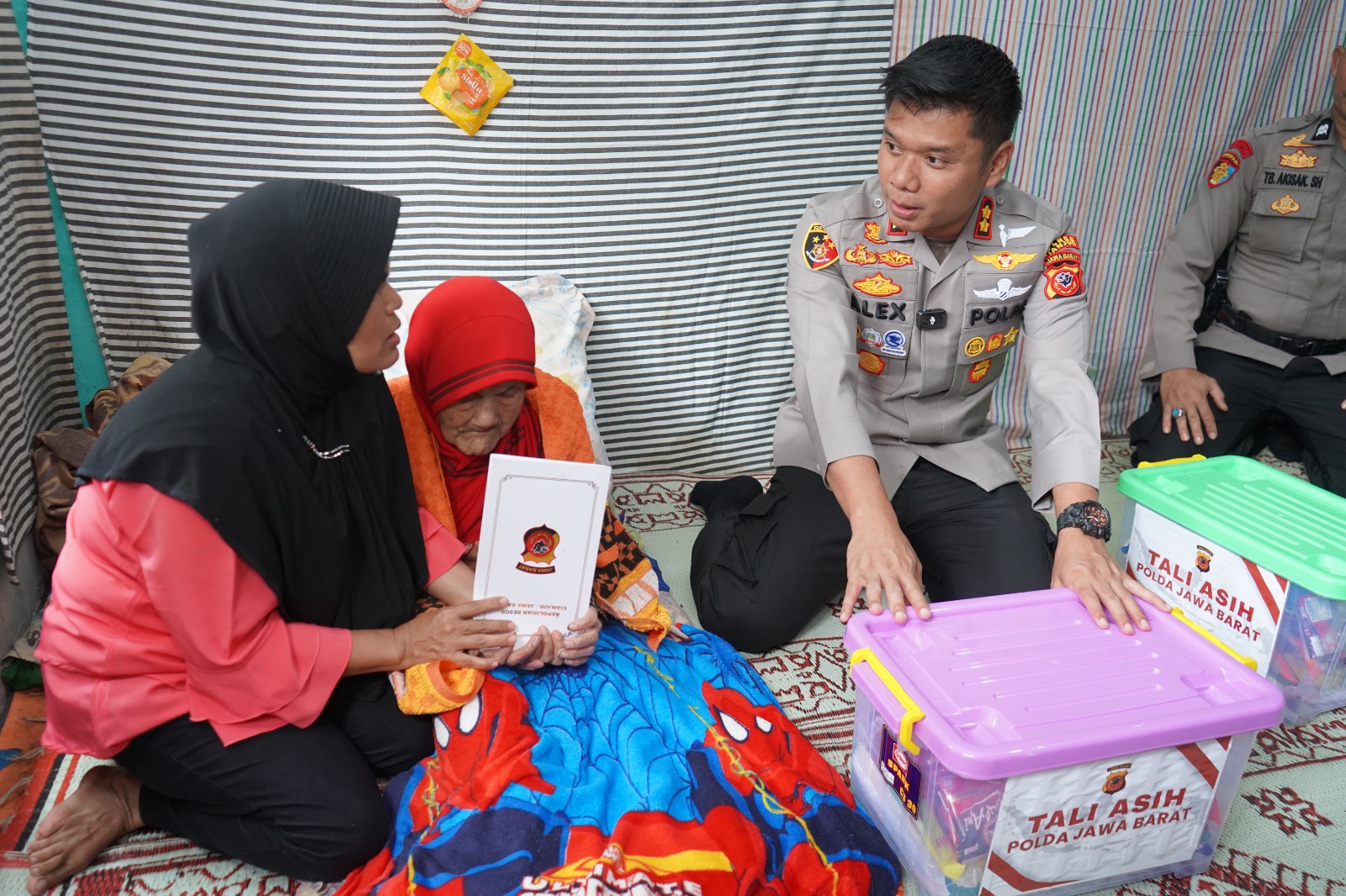 Siang itu, Kapolres Cianjur AKBP Dr. A. Alexander Yurikho Hadi bersama jajaran Pejabat Utama (PJU) Polres Cianjur datang berkunjung. Kedatangan mereka untuk menyampaikan belasungkawa sekaligus menyerahkan bantuan bagi keluarga korban.