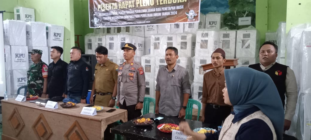 Wartacianjurnews.com–Kepolisian sektor Campaka, Polres Cianjur, bersama TNI Kodim 0608-12 Campaka mengawal Rapat Pleno Rekapitulasi Hasil Penghitungan Suara di Kecamatan Campaka, Kabupaten Cianjur, Senin (19/2).