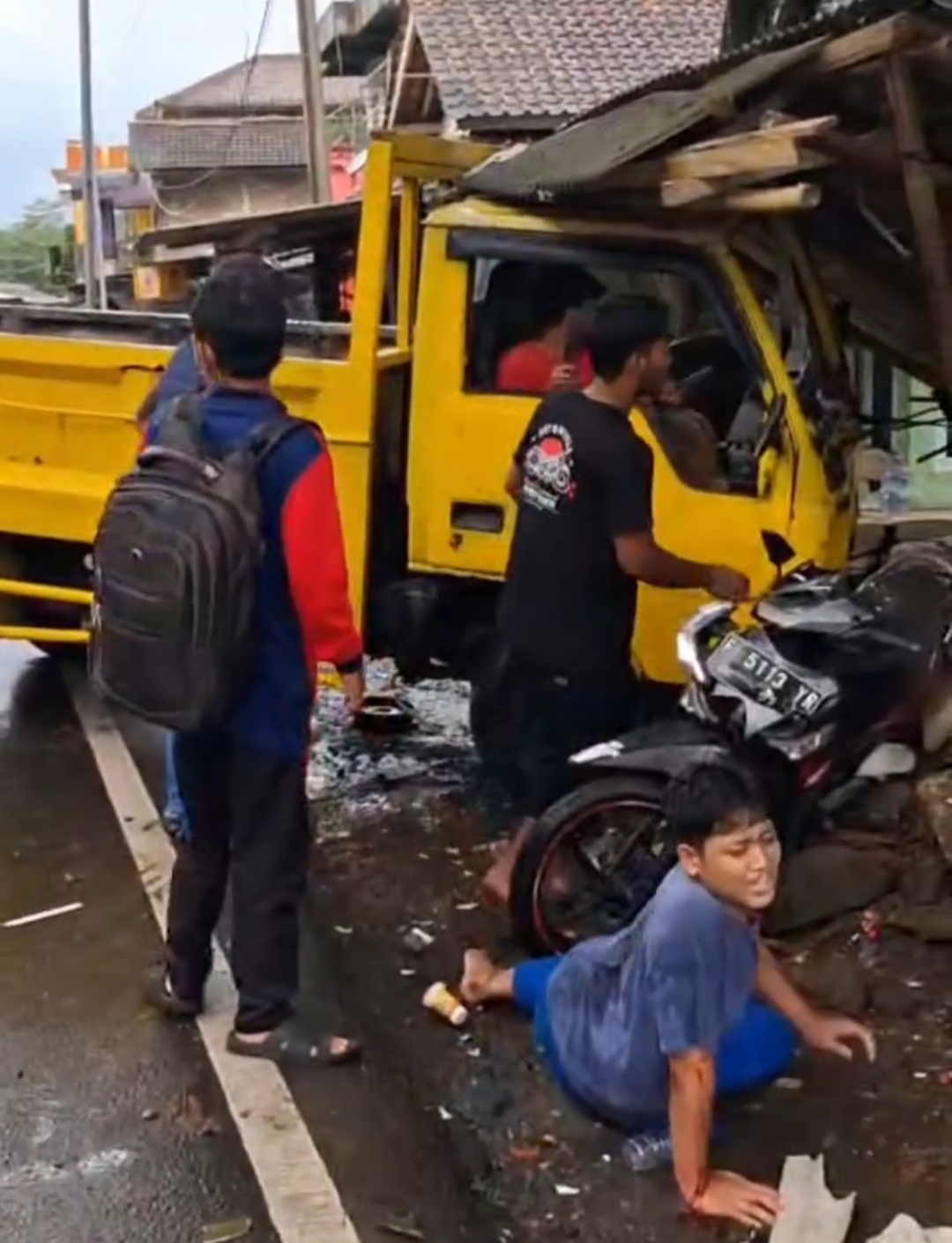 Tepat di depan salah satu Bank, truk tiba-tiba oleng dan menabrak sebuah gazebo yang berisikan para korban. Truk juga menghantam satu motor yang tengah terpakir.