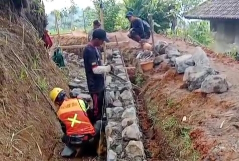 Dengan semangat para pekerja menyusun batu kali di dalam galian saluran yang sempit dan curam. Tanah merah yang rawan longsor mengapit kanan-kiri, sementara tali bentang menjadi penanda lurusnya pasangan batu. Di sanalah Wawan menghabiskan hari-harinya, membungkuk, mengangkat batu, mencampur adukan, memastikan susunan kokoh menopang aliran air.