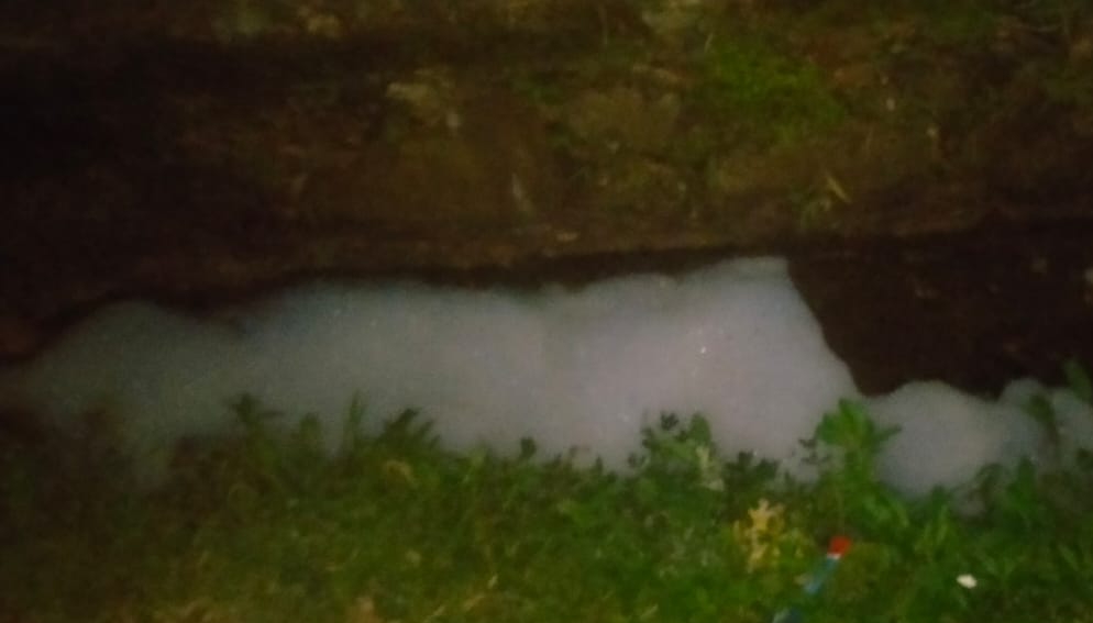 Busa putih diduga berasal dari limbah dapur SPPG Songgom tampak menggenang di aliran air dekat area persawahan warga Kampung Pondoklame, Desa Songgom, Kecamatan Gekbrong.